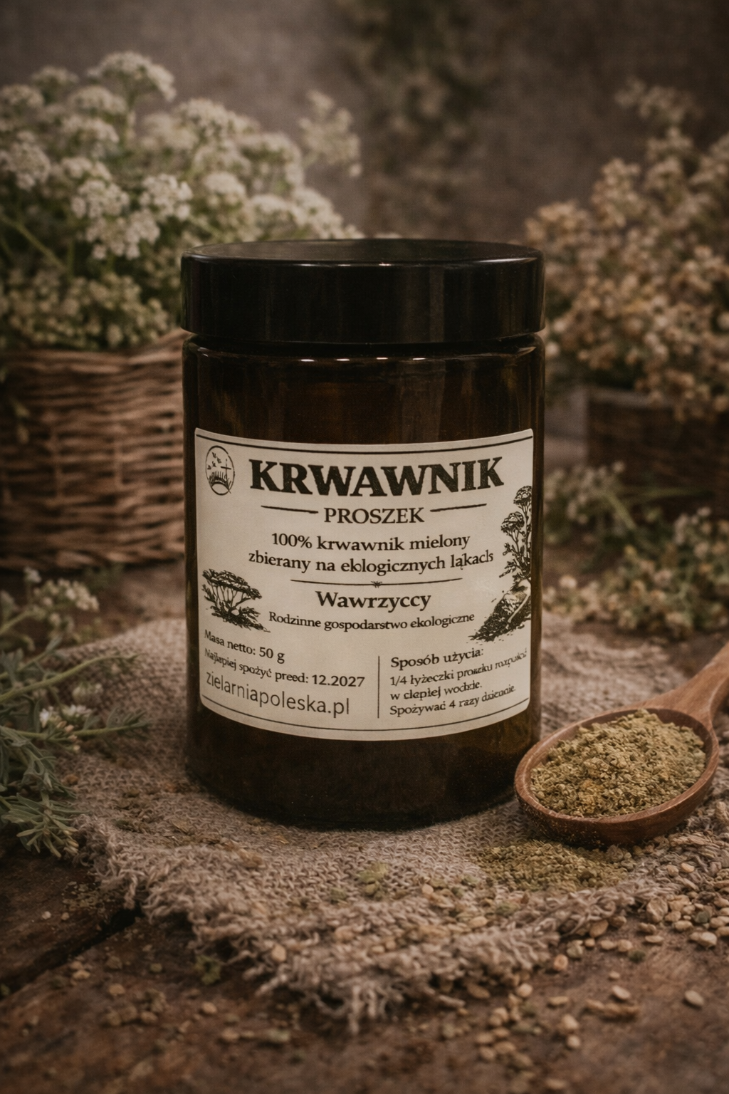 Krwawnik mielony to naturalny produkt najwyższej jakości, przygotowany z ziela krwawnika zbieranego ręcznie na czystych, ekologicznych łąkach. Surowiec pochodzi z Wawrzyccy – Rodzinnego Gospodarstwa Ekologicznego, gdzie od pokoleń dba się o tradycyjne metody zbioru i przetwarzania ziół.